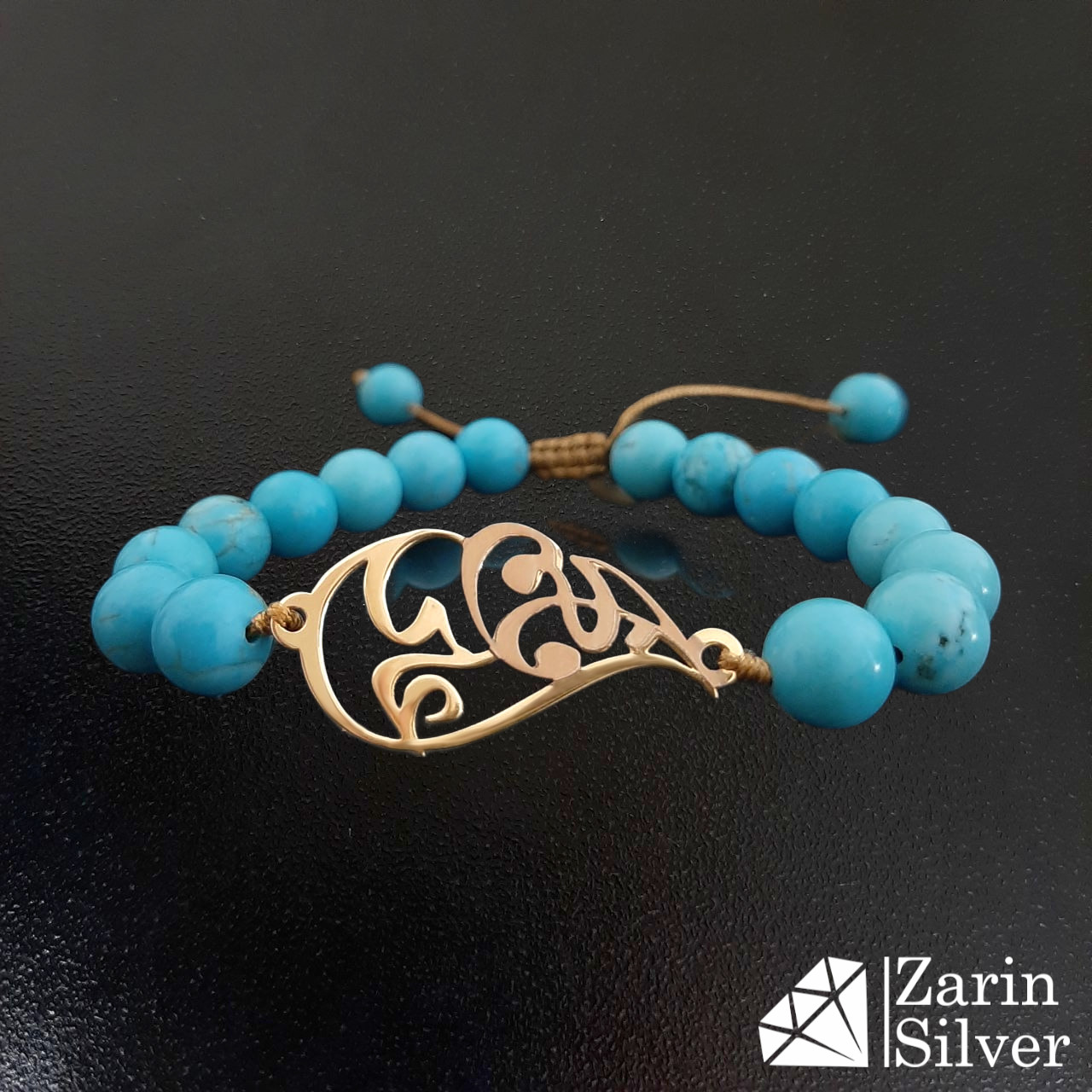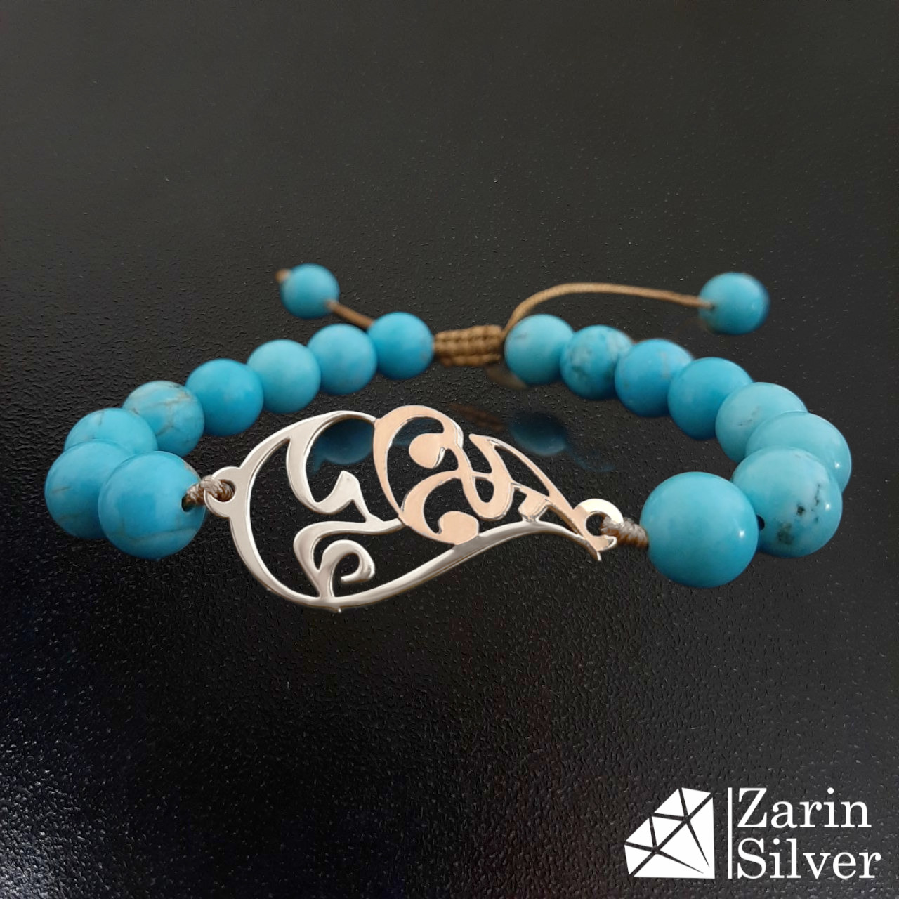 دستبند نقره و سنگ دو اسم علی و فاطمه طراحی شده در قالب بته جقه با نقره استرلینگ (925). این دستبند نقره با سنگ فیروزه آفریقایی پاک نیز تزئین شده است. علاوه بر قاب بته جقه که از طرح های اصیل ایرانی است؛ میتوانید نام خود و کسی که دوستش دارید را به صورت ساده و یا با انواع قاب های هندسی و غیر هندسی دیگر، برای طراحی سفارش دهید.