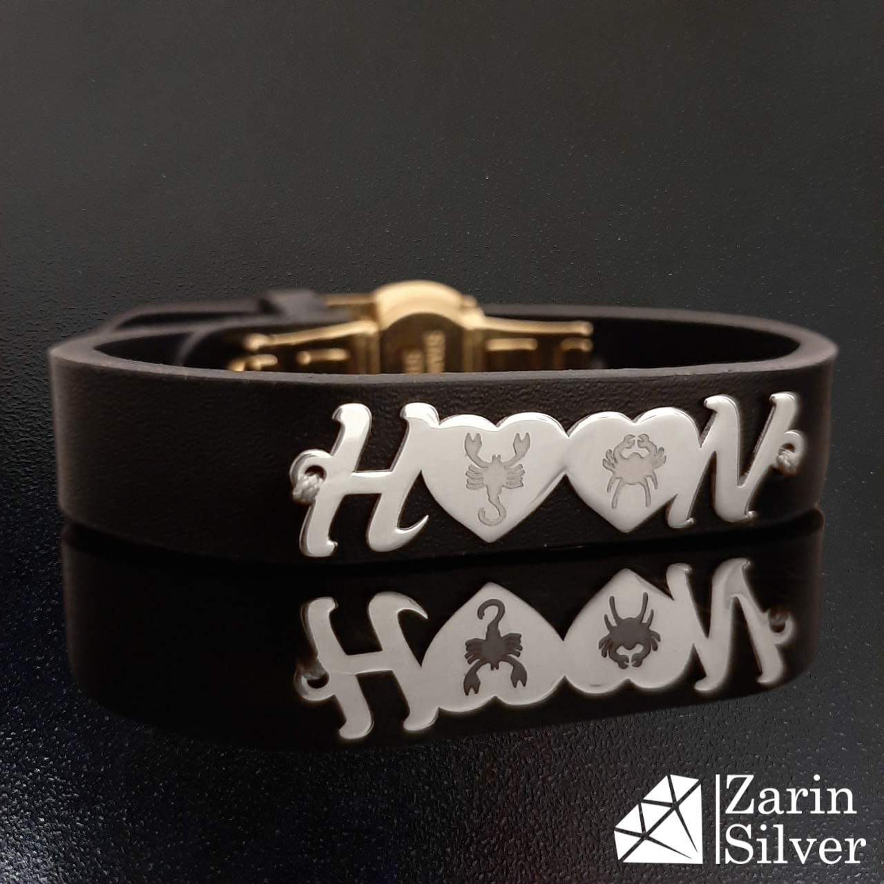 دستبند نقره و چرم حروف ساخته شده با نقره استرلینگ (925)، توسط زرین سیلور. این مدل دستبند های نقره حروف مناسب هدیه به کسی است که دوستش دارید تا حروف اسم و ویژگی های شخصیتی خود را همیشه کنار یکدیگر داشته باشید. ست دستبند نقره و چرم از محصولات پر طرفدار در بین زوج های جوان میباشد. علاوه بر طرح قلب استفاده شده، نماد ماه های تولد زوج نیز برو روی قلب ها حک شده است.
