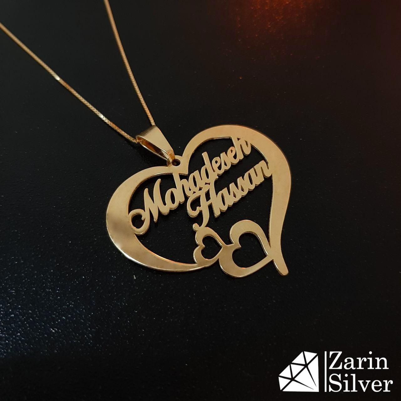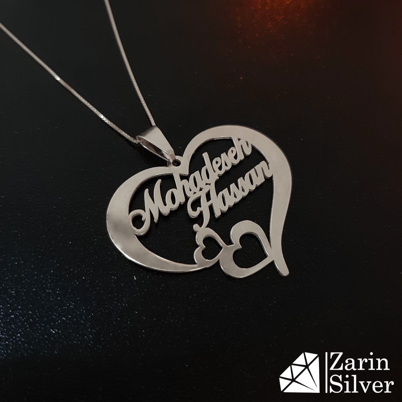 ترکیب اسامی در پلاک نقره زنانه همواره نشان دهنده عشق ما بین آن هاست و وقتی اسامی داخل قلب قرار میگیرند این عشق را بیشتر به رخ میکشند. دو قلب کوچکی که در داخل قلب بزرگ تر وجود دارند، هارمونی زیبایی با قلب بزرگتر این آویز گردنبند نقره ایجاد کرده اند که باعث زیبایی بیشتر این گردنبند نقره ظریف شده است