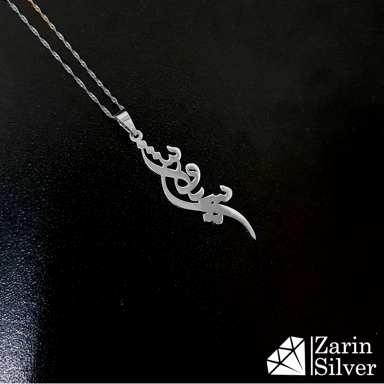 طراحی عمودی گردنبند نقره ساده و تلفیق آن با خطاطی نستعلیق باعث شده این پلاک نقره زنانه چشم نواز تر باشد. بهم پیچیدگی حروف در پلاک های نقره باعث ناخوانایی آن ها شده که جزو طراحی های محبوب در حیطه ی نقره سازی محسوب می شود