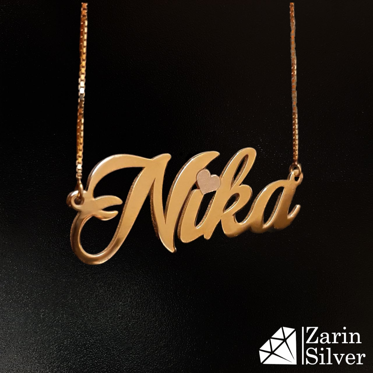 پلاک نقره اسم نیکا به زبان لاتین و به صورت حلقه طرفین ساخته شده است در این پلاک نقره دخترانه نقطه به صورت قلب طراحی شده است که حالتی دخترانه به این گردنبند نقره اسم بخشیده است. شما نیز می توانید این نوع گردنبند نقره ظریف را با هر اسمی که مد نظرتان است، سفارش دهید و از استفاده از آن لذت ببرید