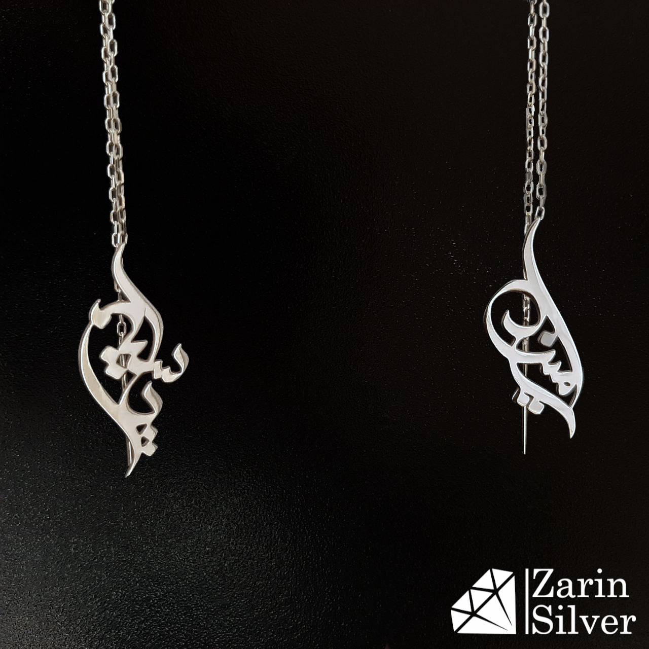 این گوشواره نقره زنانه به صورت بخیه ای و با نقره 925 عیار ساخته شده است. گوشواره نقره بخیه ای یکی از محبوب ترین گوشواره ها در میان خانم هاست و شما میتوانید آن را با اسامی مد نظرتان سفارش دهید. برای مثال مشتری عزیزمان اسامی فرزندان خود را به صورت گوشواره نقره 925 عیار سفارش داده است.
