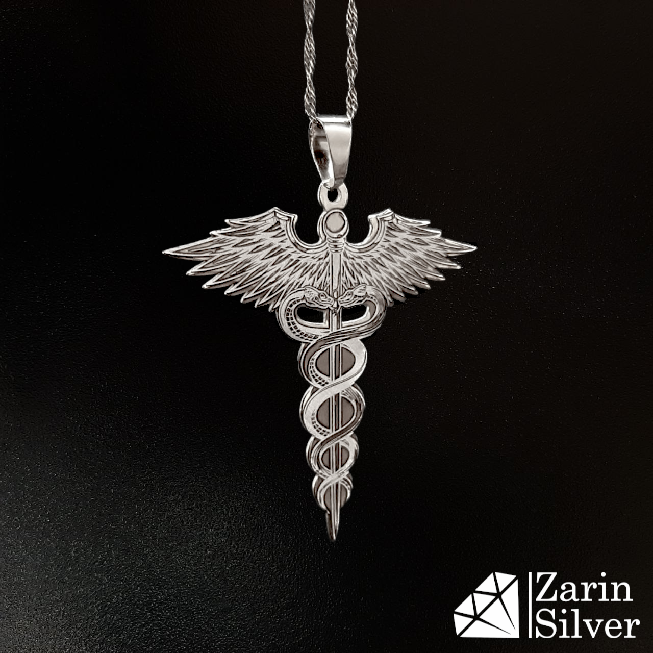 طراحی این پلاک نقره زنانه از روی نماد کادوسه که معرف حرفه ی پزشکی، دارو و درمان است، انجام شده که به صورت دو ماری که دور عصا پیچیده شده اند، روی پلاک حکاکی شده است. از آنجایی که این نماد در بین کادر درمان بسیار محبوب است، شما می توانید با هدیه دادن این آویز گردنبند نقره، لبخند را به لبان آنان هدیه کنید